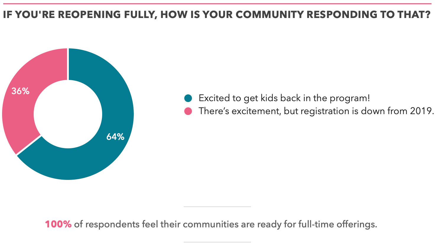 However, we discovered an encouraging indicator for industry growth in our survey findings. 100% responded that their community’s parents were excited to get their kids back into full-time care for programs that reopened this fall. What’s more, 0% of respondents feel their communities were not ready for full-time offerings.