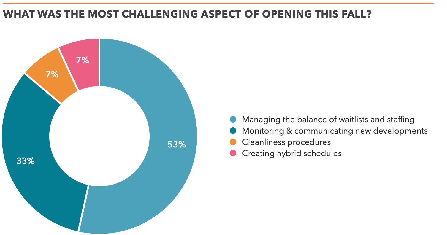 In correlation, last year, when we asked programs what the most challenging aspects of opening in the fall were? A majority answered, creating a hybrid schedule. This year, programs hardly acknowledged this as a challenge. A testament to the progress made.