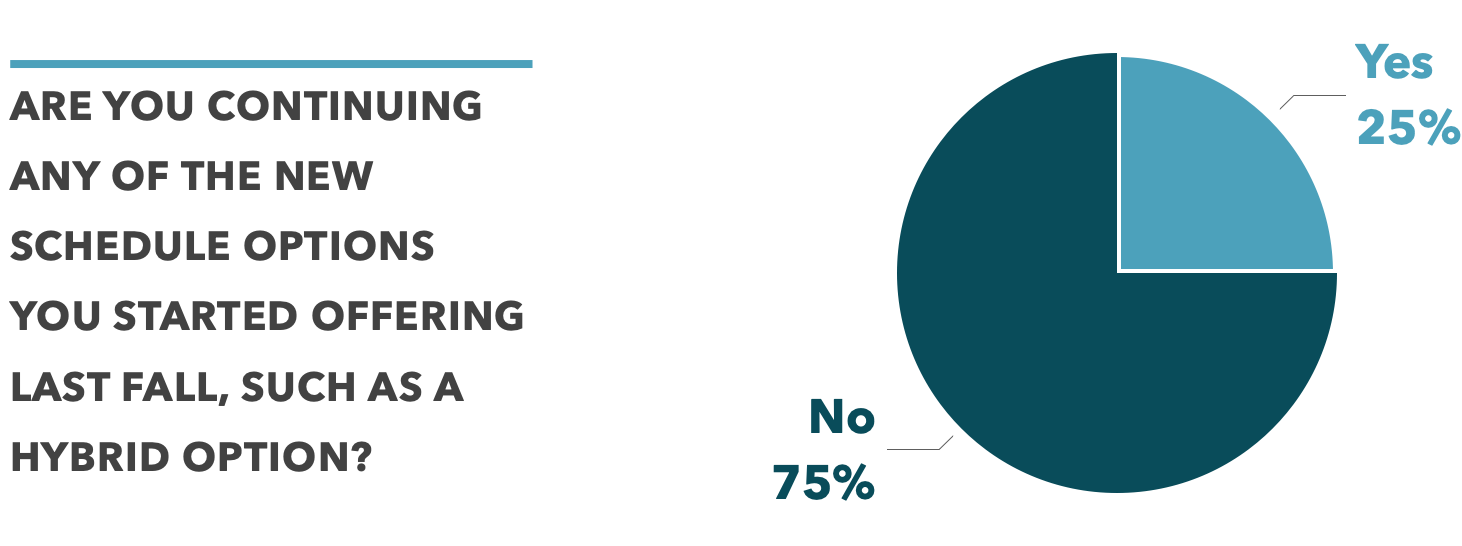Compared to last year, the percentage of programs offering hybrid/online program scheduling is down 62%.