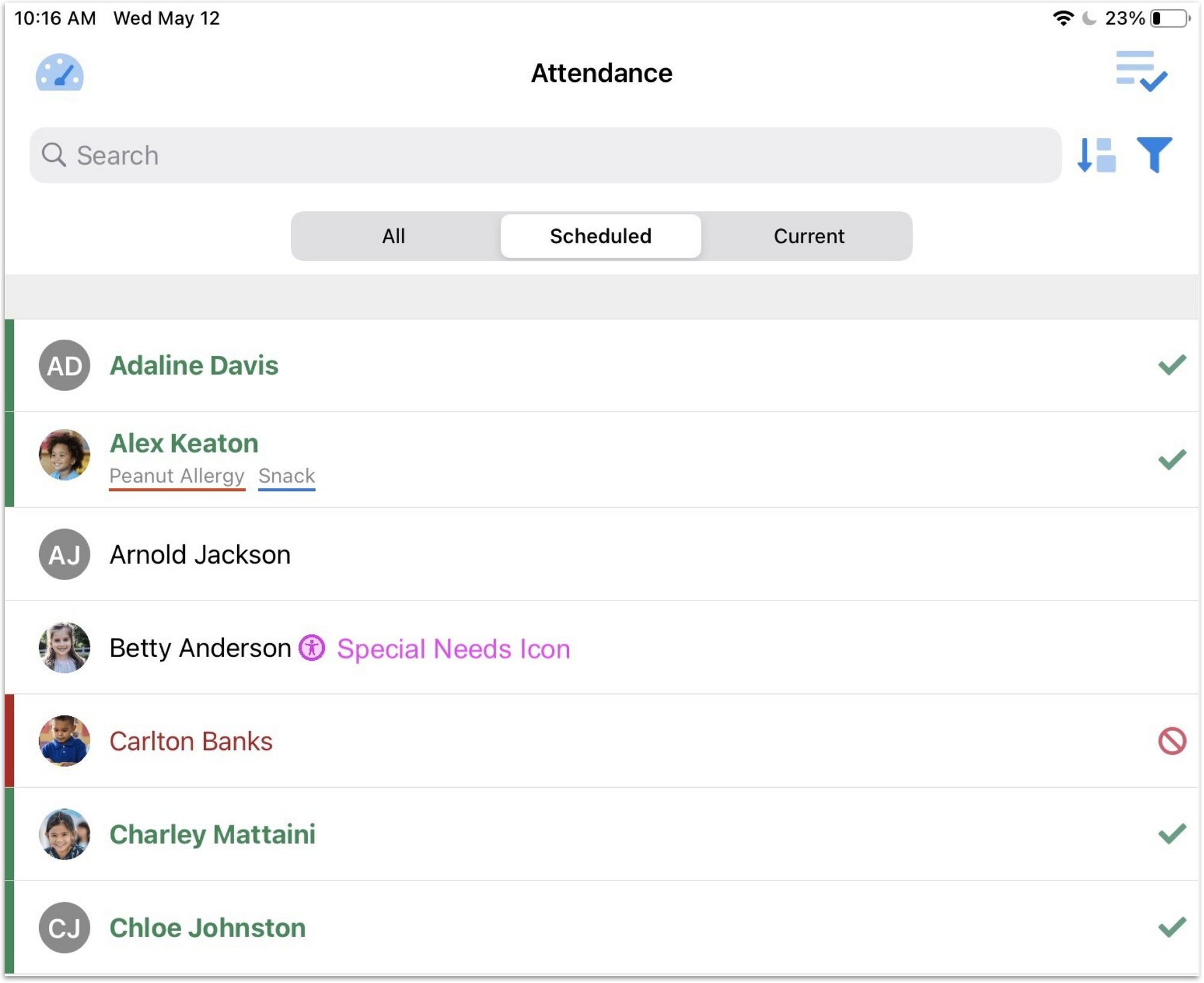 - A marked absent child will now have their name highlighted in red and display a red bar next to their name.