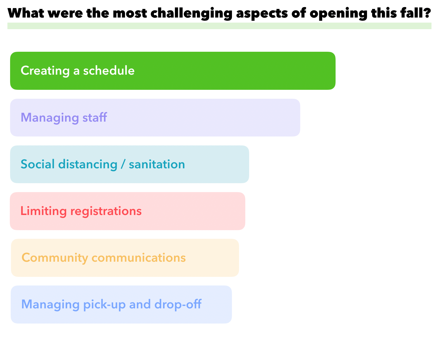 New schedule types and COVID-19 protocols have brought forward a plethora of challenges for after school leaders. When determining what the most significant obstacles were this season, programs were in large agreement that creating schedules and managing a fluid staffing situation were large hurdles.