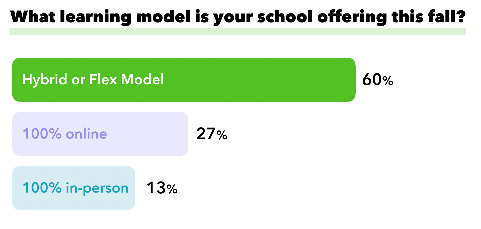 When programs did start this season, they began in completely new schedule types. Throughout the summer, there were many conversations on if programs would remain in person, move fully online or if schools would develop a new hybrid or flex model. When we surveyed districts across the nation, we see that most moved forward with a hybrid learning model.